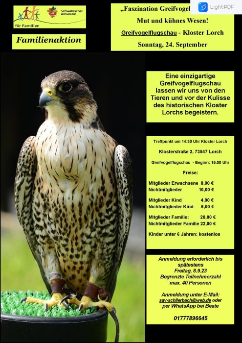 Familiengruppe: „Faszination Greifvogel. Schönheit, Mut und kühnes Wesen! So., 24.09.2023, Uhrzeit: 00:00 iCalendar Mit dem Laden der Karte akzeptieren Sie die Datenschutzerklärung von Google.Mehr erfahren Karte laden Google Maps immer entsperren zur Übersicht